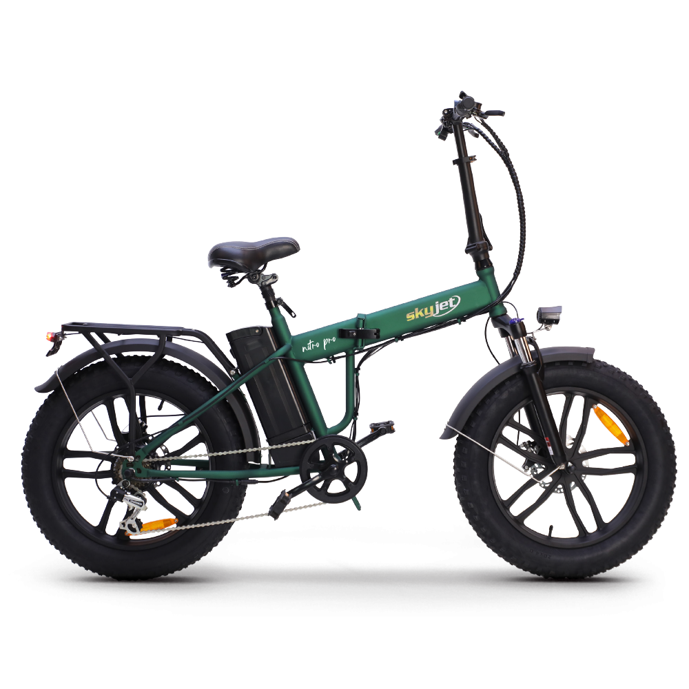 Daha fazla çekim gücüne sahip SKYJET motor… SKYJET’ın katlanabilir elektrikli bisiklet olan NITRO PRO ile tanışın. Geliştirilmiş 250 Watt motor ve 36V 10 Ah Batarya ile kullanılan NITRO PRO, kısa mesafelere gidip gelmek için mükemmel güç ve pil ömrününe sahiptir. Saatte 25 km/h hızda şarj başına 35-45 km sürüş yapın! Şok emici fat lastikleri ve disk fren sistemini kullanarak şehirin sokaklarında kolayca gezinin.